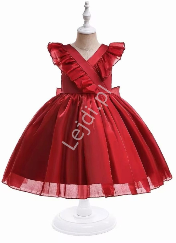Bordowa sukienka dla dziewczynki z połyskującej organzy. Rozkloszowana sukienka dla dziewczynki z falbankami. Mocno rozkloszowana sukienka dla dziewczynki na wesele, na bal, na urodzinowe przyjęcia. Tanie sukienki wieczorowe dla dziewczynek.