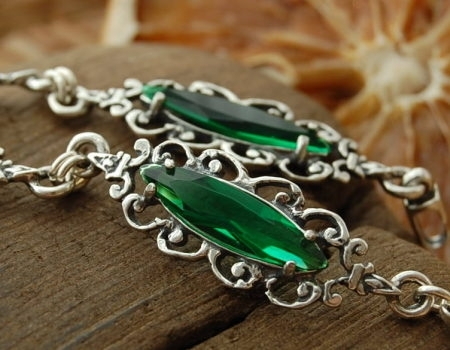 Delikatne srebrne kolczyki, w których ażurowe oksydowane oprawy zostały zakute piękne szmaragdy syntetyczne.