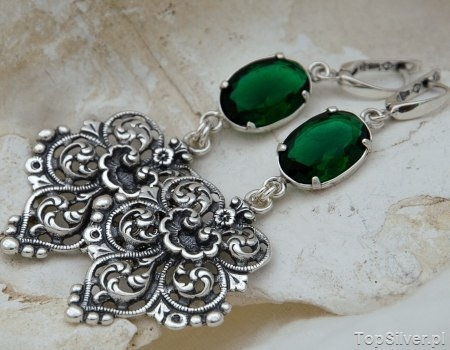Drodzy Państwo, przedstawiamy wyjątkowe, srebrne kolczyki, będące odzwierciedleniem typowo secesyjnego (nazywanego także Art Nouveau) wzornictwa królującego w jubilerstwie. Mistrzowsko wykonane zdobienia w połączeniu z doskonale wybarwionym szmaragdem (synt. o rozmiarze 14x10mm) to nielada gratka dla miłośników niebanalnej biżuterii. Kamień, to sprzyjający astrologicznie osobom spod znaku byka oraz raka. Ale naszym zdaniem to idealny pomysł na prezent dla wszystkich miłośniczek srebrnej biżuterii.
