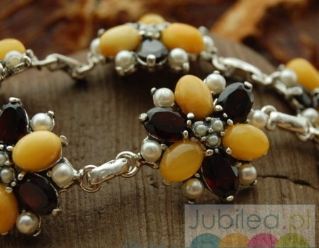 MARIANO – srebrna bransoleta perły, granaty i bursztyny