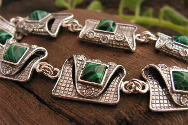 Bardzo okazała srebrna, oksydowana bransoleta, w której misterny wzór wkomponowano kwadratowy malachit i cztery białe kryształki (w każdym ogniwie).