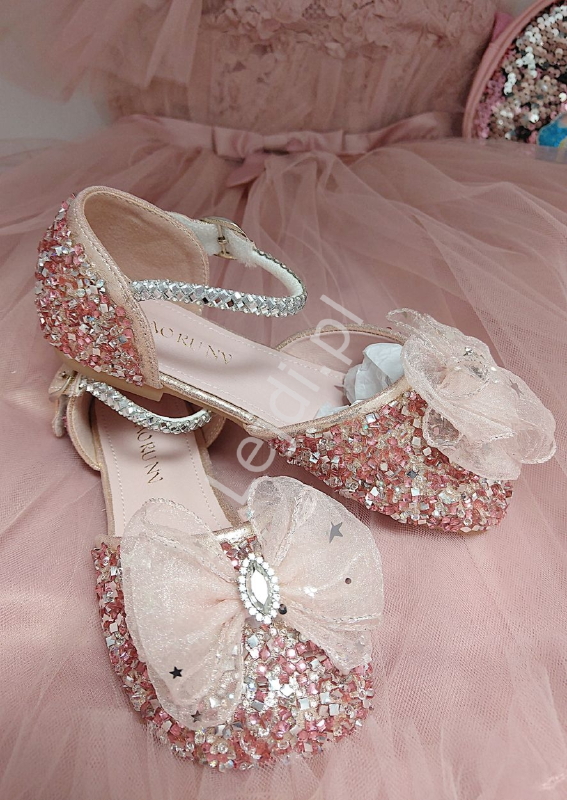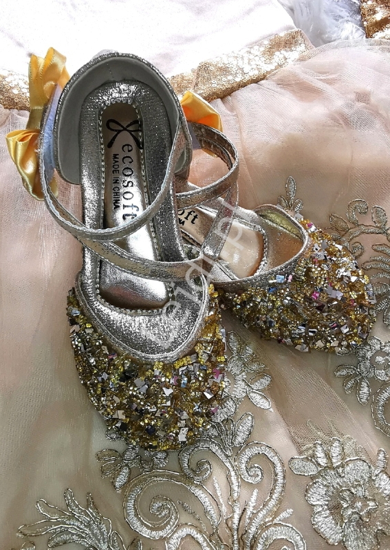 Złote srebrne wieczorowe buciki dla dziewczynki z kokardą i cekinami H80
