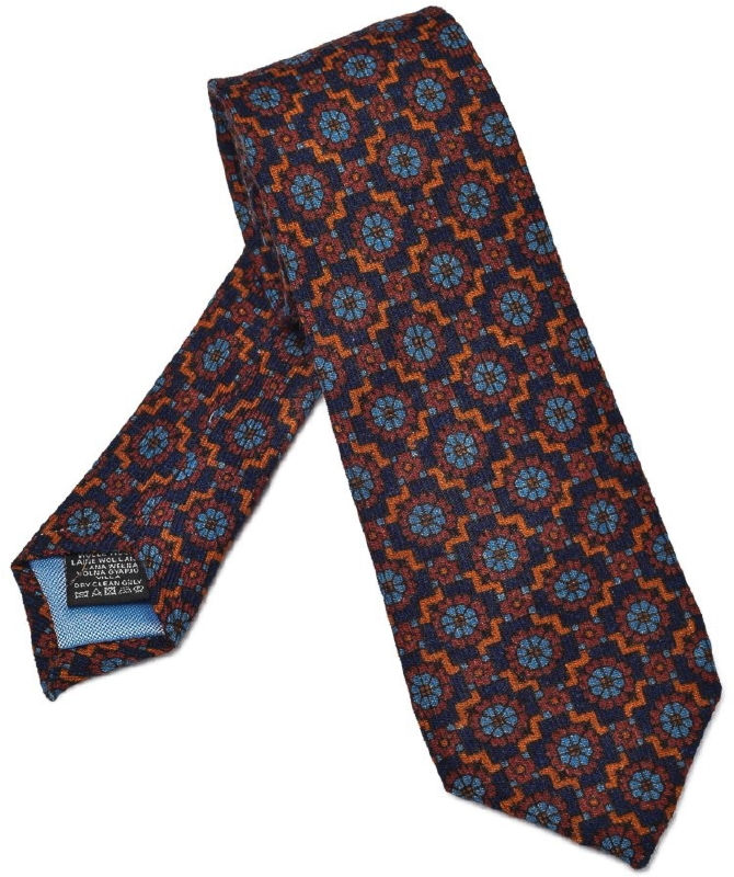 Granatowy krawat wełniany w pomarańczowy wzór