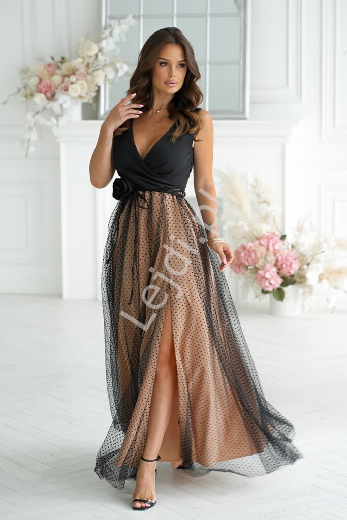 Czarna suknia wieczorowa w groszki z tiulową spódnicą HB318