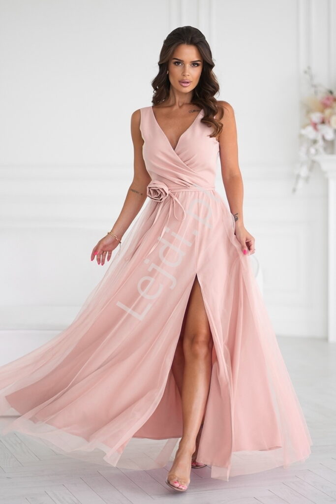 Pustynno różowa sukienka wieczorowa z rękawkami ala motylek, modna sukienka na wesele, na studniówkę 0183