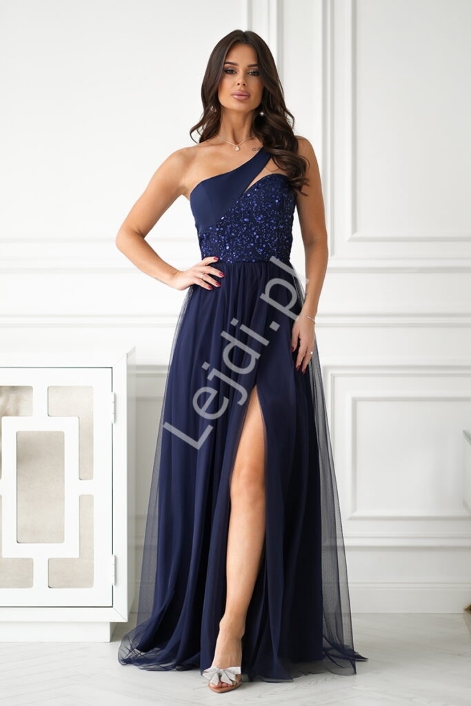 Granatowa sukienka na jedno ramię z tiulowym dołem, studniówka, karnawał HB323