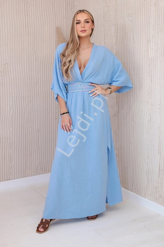 Sukienka muślinowa z haftem w talii błękitna, boho