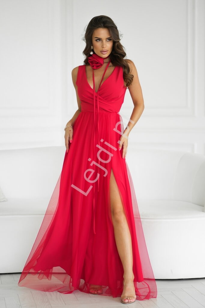 Czerwona suknia na studniówkę, wesele, sylwestra z różą HB318 , r.34 – r.48 , Plus Size