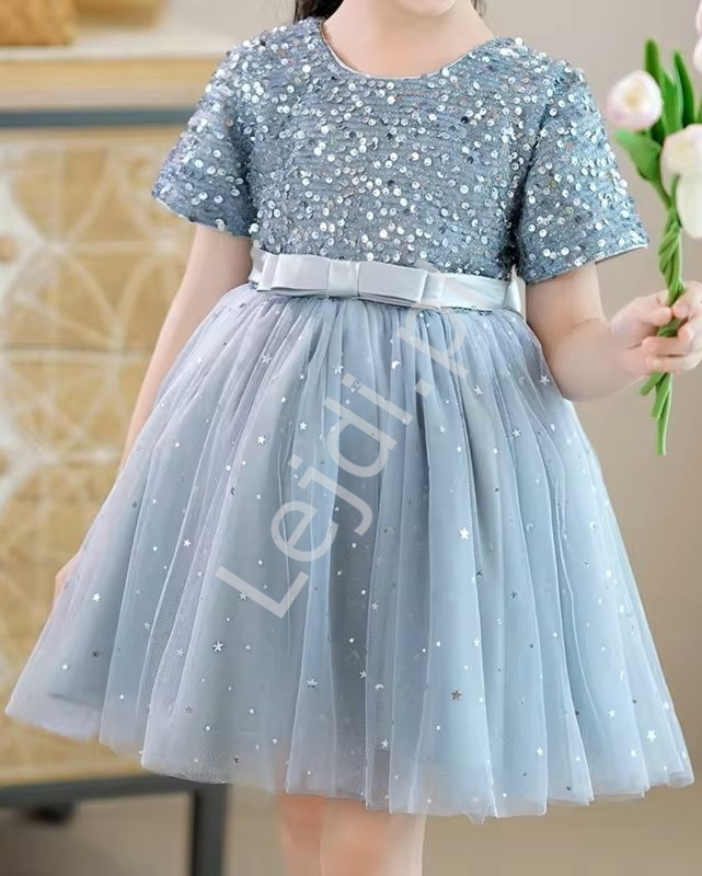 Krótka sukienka wieczorowa dla dziewczynki z cekinami i gwiazdkami szara 6632