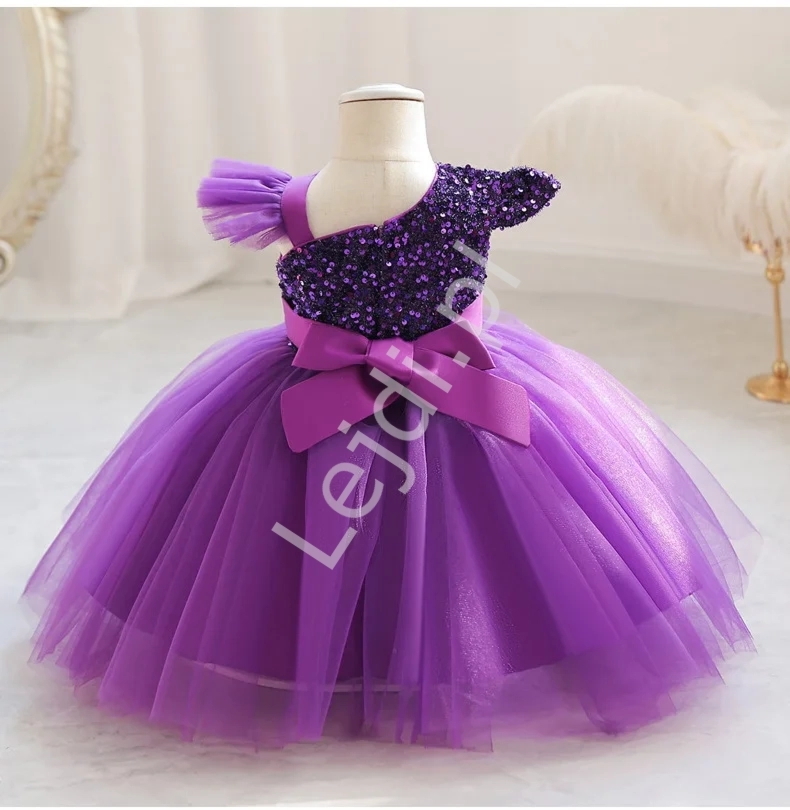 Krótka fioletowa sukienka wieczorowa dla dziewczynki z cekinami na jednym ramieniu 132