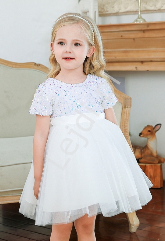 Biała sukienka dla dziewczynki z tęczowymi cekinami 737