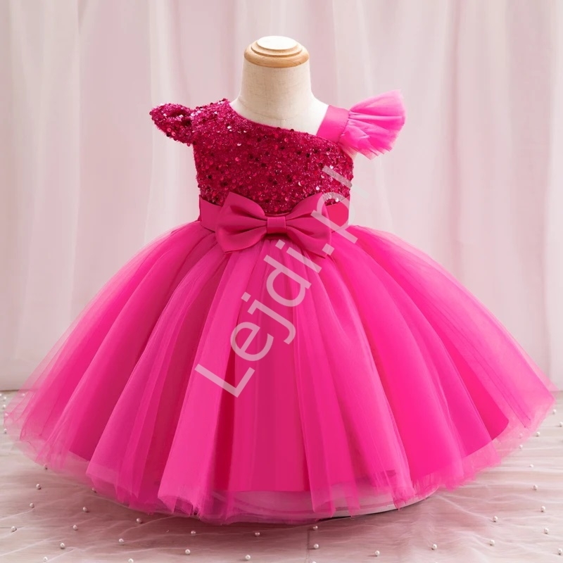Krótka fuksjowa sukienka wieczorowa dla dziewczynki z cekinami na jednym ramieniu 132
