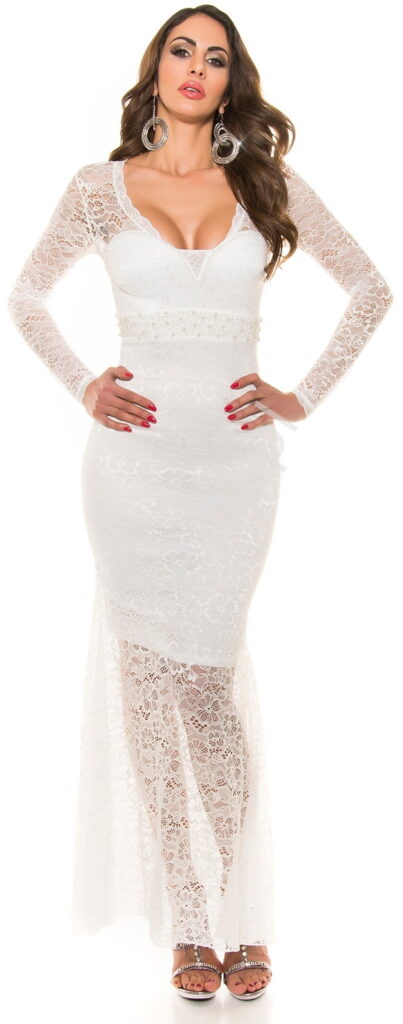 Biała suknia wieczorowa koronkowa w stylu retro z koralikami z długim rękawem 9149