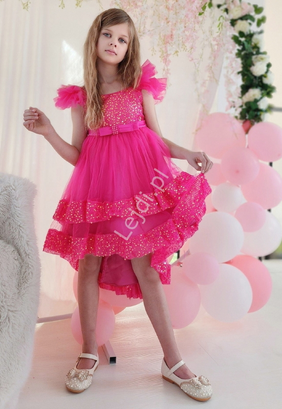 Ciemno różowa sukienka z cekinami i tiulem dla dziewczynki z dłuższym tyłem 183