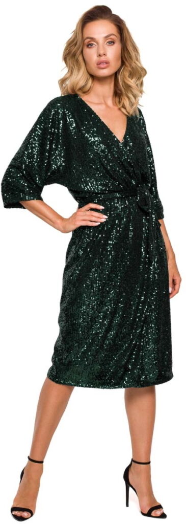 Cekinowa Sukienka Kopertowa z Wiązaniem – Zielona