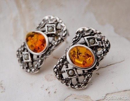 Piękne srebrne ażurowe kolczyki, których wzornictwo inspirowane jest barokowymi motywami zdobniczymi. W każdym kolczyku centralne miejsce zajmuje naturalny bursztyn I małe perełki po obu jego stronach.
