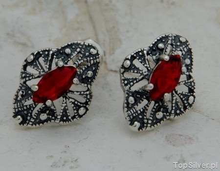 Piekne srebrne kolczyki utrzymane w stylistyce międzywojennej. W misterny motyw zdobniczy zakuty został rubin (synt). Srebro pokryte oksydą.