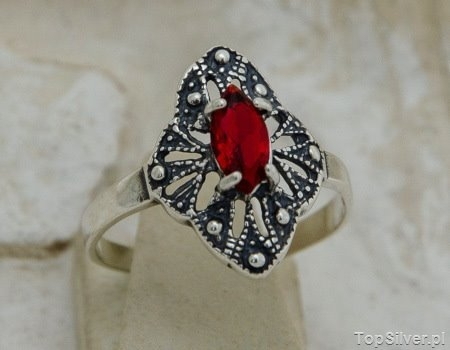 Piękny srebrny, pierścionek utrzymany w stylistyce międzywojennej. W misterny motyw zdoniczy zakuty został rubin (synt).