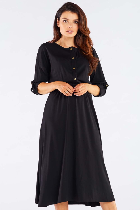 Wiskozowa Midi Sukienka z Ozdobnymi Napkami – Czarna