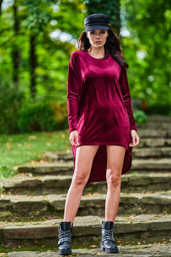 Welurowa Swobodna Sukienka z Przedłużonym Tyłem