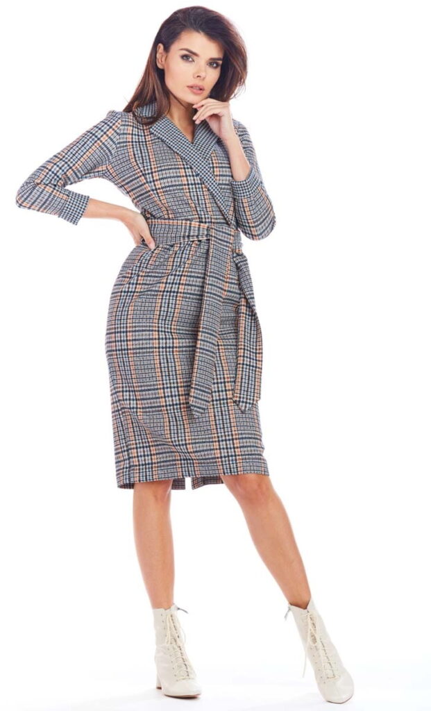 Klasyczna Sukienka w Kratę z Kopertowym Dekoltem – Granatowa