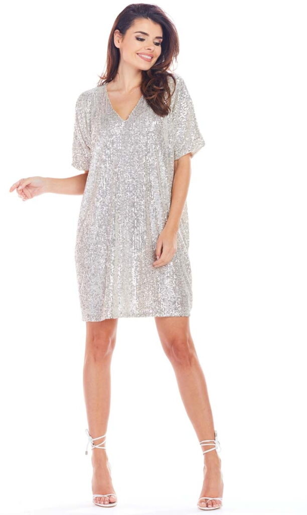 Beżowa Cekinowa Sukienka o Luźnym Kroju