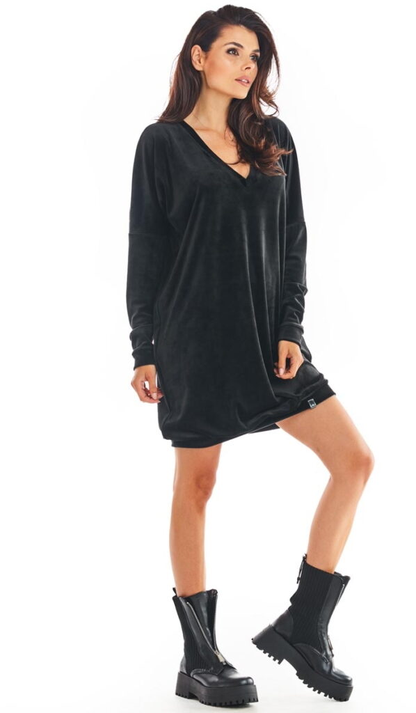 Czarna Welurowa Sukienka w Serek ze Ściągaczami