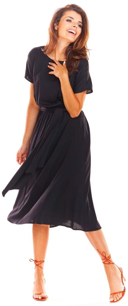 Czarna Rozkloszowana Midi Sukienka z Krótkim Kimonowym Rękawem
