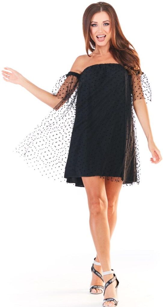 Czarna Sukienka Typu Hiszpanka z Siateczką w Groszki
