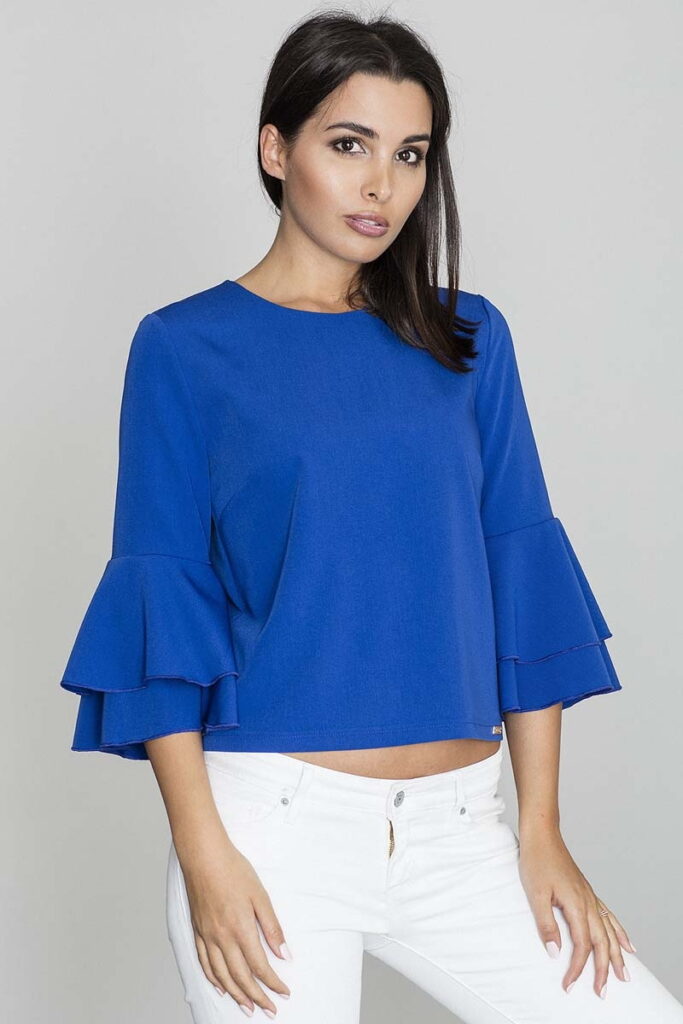 Niebieska Krótka Bluzka z Rozkloszowanymi Rękawami
