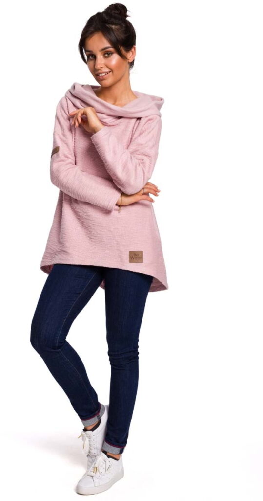 Pudrowa Asymetryczna Bluza Oversize z Kapturem