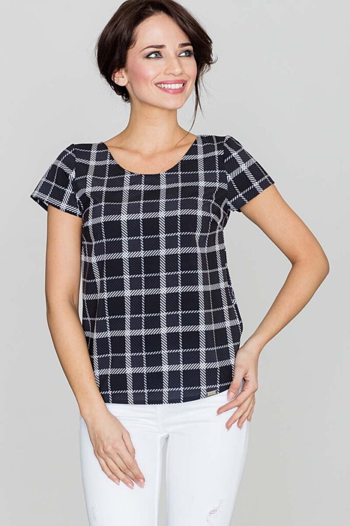 Czarna Bluzka w Kratę z Krótkim Rękawem