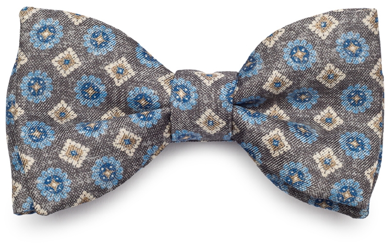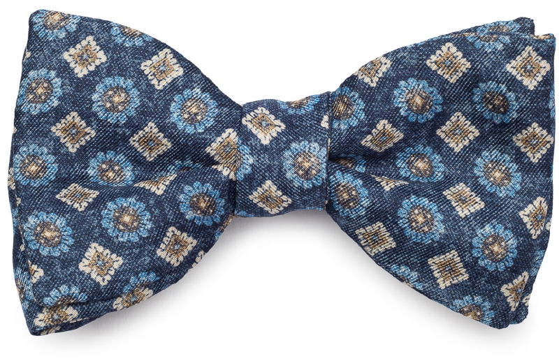Beżowa mucha wiązana Hemley w niebieskie i beżowe kwiaty