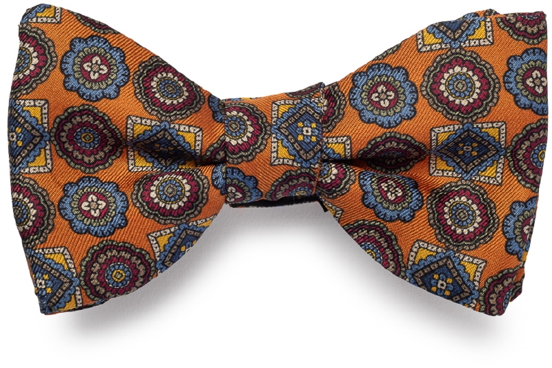 Elegancka mucha jedwabna wiązana pomarańczowa w granatowe rozety Hemley