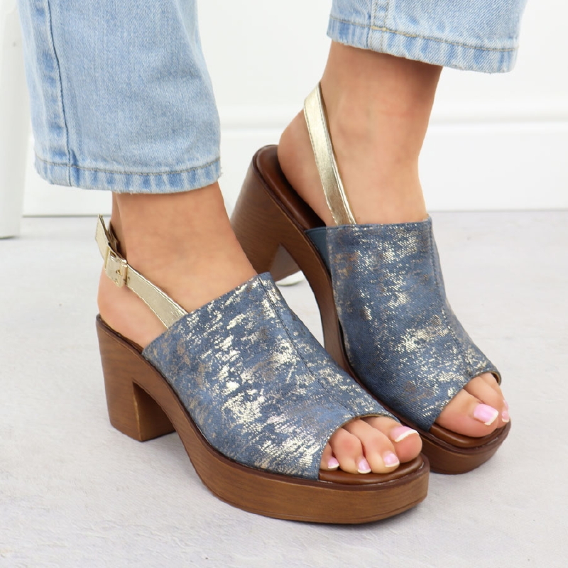 Sandały damskie na słupku jeansowe pozłacane M.Daszyński MR23126-7