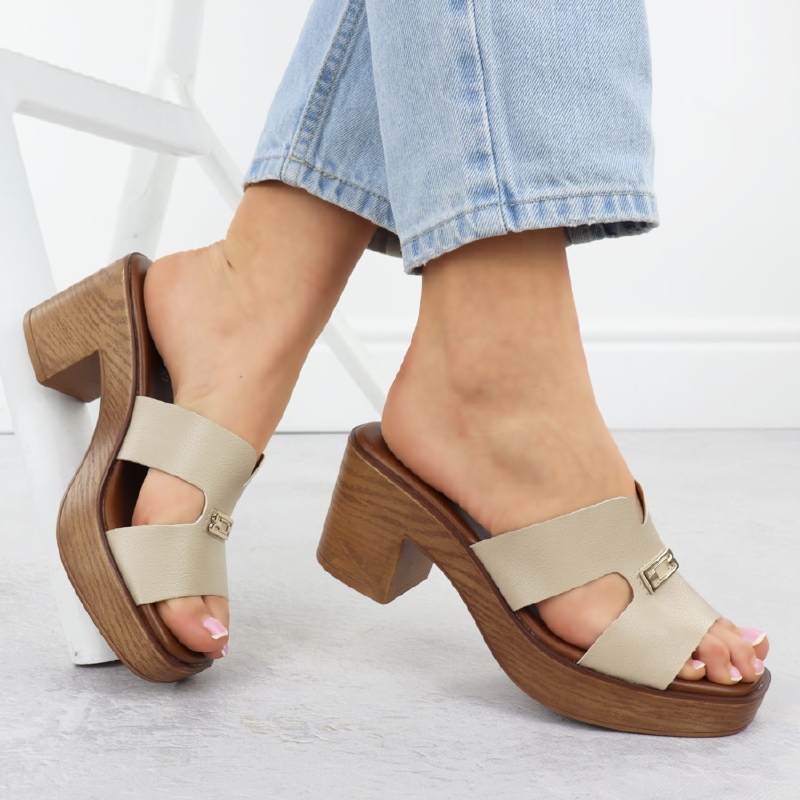 Klapki damskie na słupku beżowe M.Daszyński MR23126-11