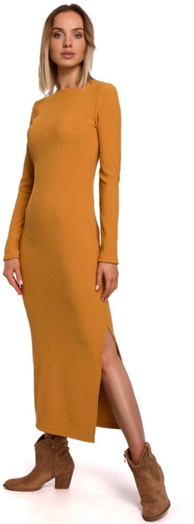 Prążkowana Maxi Sukienka z Rozcięciem – Musztardowa