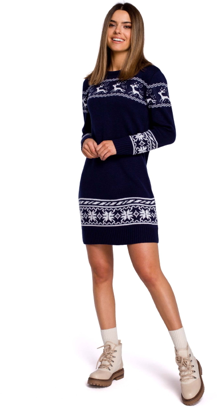 Granatowa Prosta Swetrowa Sukienka ze Świątecznym Motywem