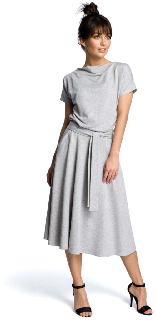 Szara Midi Sukienka z Szerokim Dołem