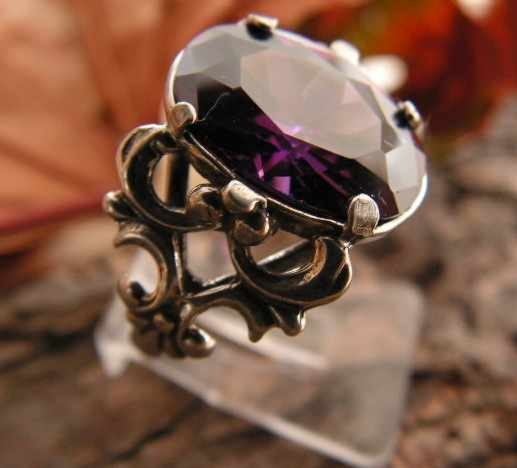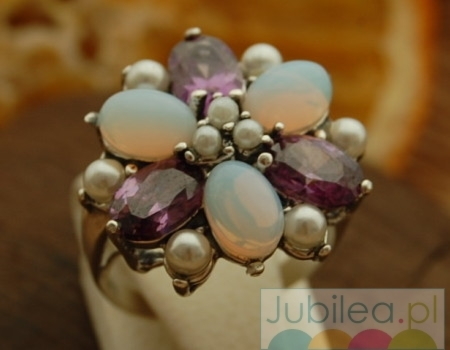 PAWIE OKO – srebrny pierścień perły ametysty opale