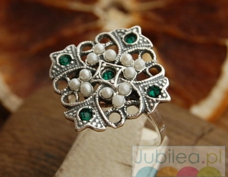BIZZ – srebrny pierścionek perły i szmaragdy