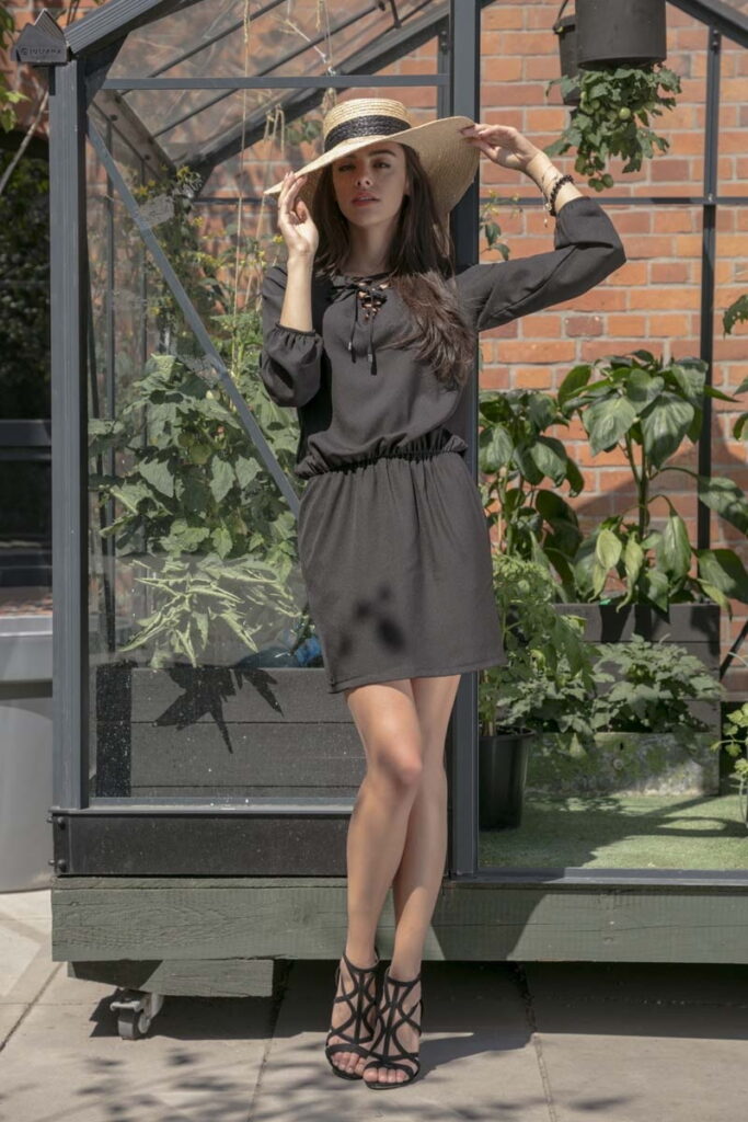 Czarna Codzienna Komfortowa Sukienka Sznurowana przy Dekolcie