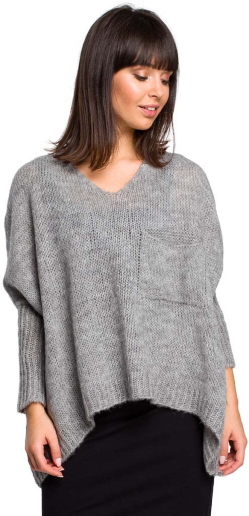 Szary Asymetryczny Oversizowy Sweter z Kieszonką