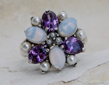 PAWIE OKO – srebrny pierścień perły ametysty opale