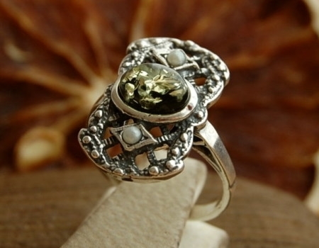 LORENA – srebrny pierścionek z bursztynem i perłam
