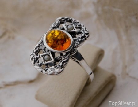 IRIS – srebrny pierścionek z bursztynem i perłami