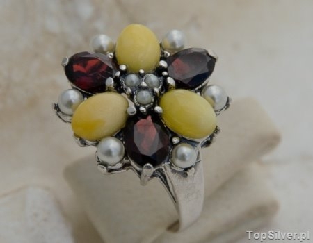 MARIANO – srebrny pierścień granaty, perły i bursztyny