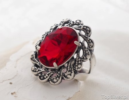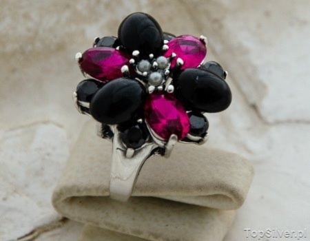 DELFIA – srebrny pierścień rubiny, perły i onyksy